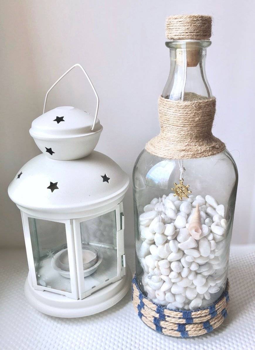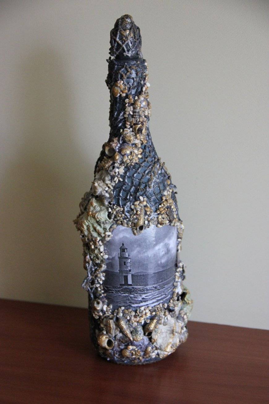 Можно камешками и ракушками украсить емкость по диагонали или замысловатым узором. Но не наклеить, а обвалять бутыль в пластилине, а сверху хорошо разместятся ракушки, стеклышки и камни.