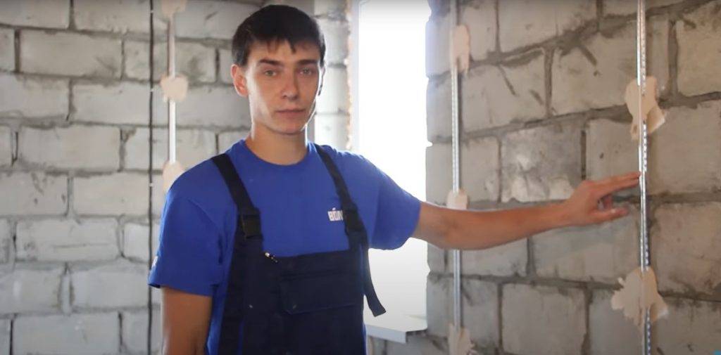Рис. 4. Выравнивание стены штукатурной смесью по маякам.