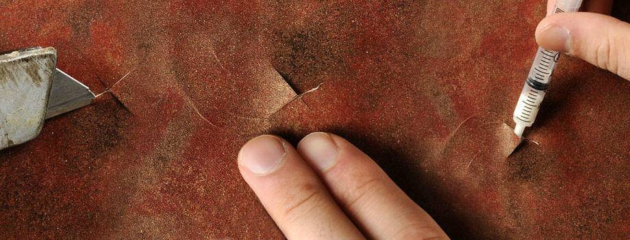 - После этого попробуйте аккуратно расправить обои, в шприц наберите клей и выдавите через разрез в обои;