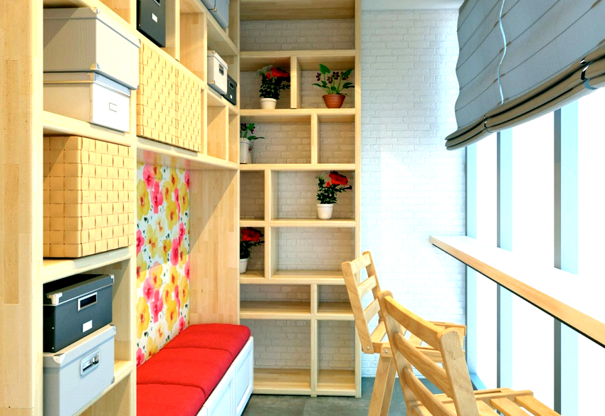 Помимо возможности внутреннего размещения полок, шкафы на балконах могут быть оснащены выдвижными стульчиками или лавкой, на которой можно отдохнуть после тяжелого трудового дня