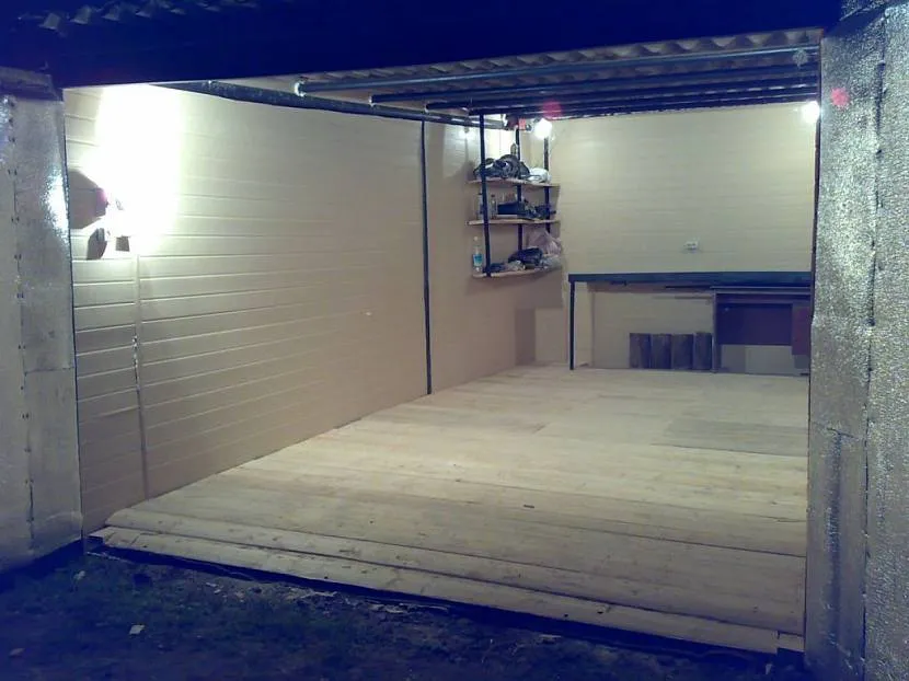 Гараж можно отделать деревянной или пластиковой вагонкой. Деревянная отличается повышенной возгораемостью, но, несмотря на это, многие автолюбители выбирают для своих гаражей именно такой вариант облицовки. Здесь огромную роль играет эстетическая привлекательность деревянных панелей, которые делают техническое помещение более комфортным для длительного пребывания.