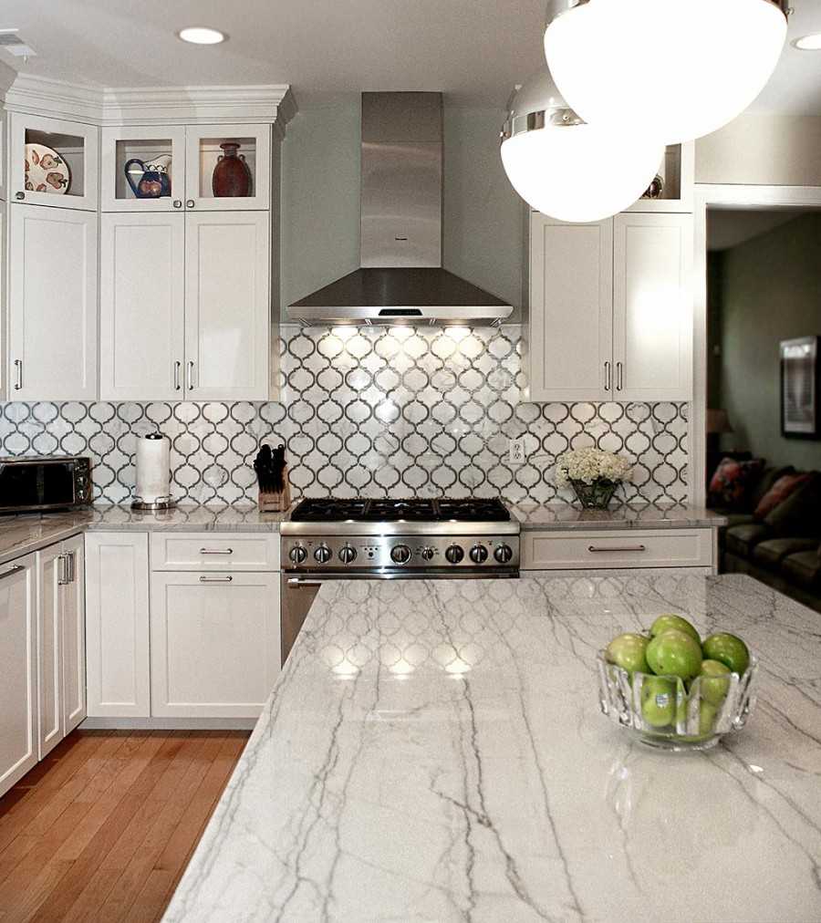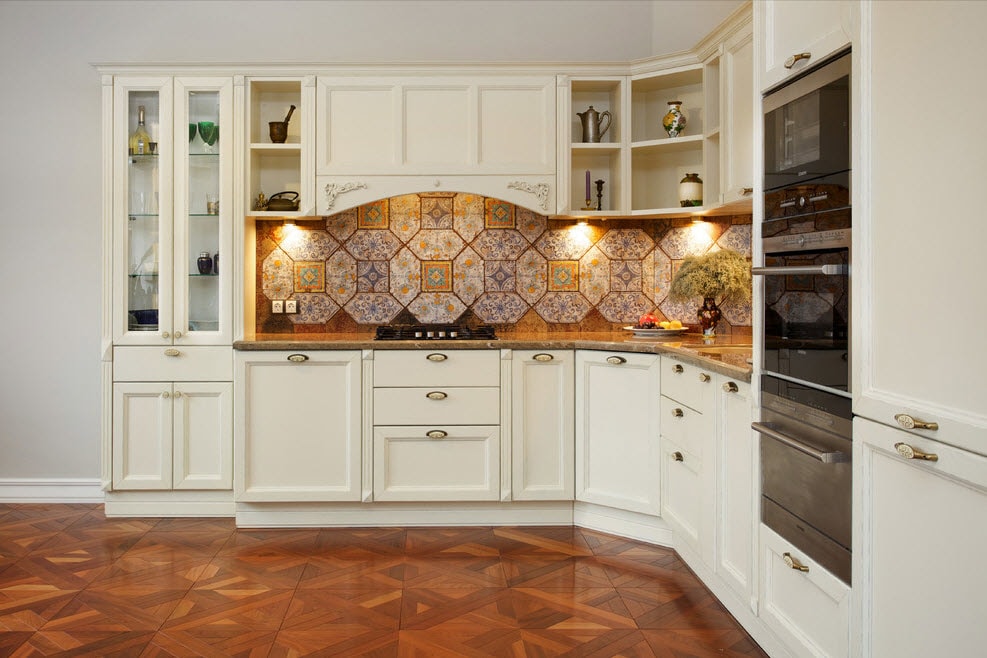 Фартук над раковиной, плитой и столешницей должен быть из керамической плитки. Сегодня эту поверхность также закрывают пластиком или другими современными материалами. Они подбираются по тону под основной цвет кухни, также могут с ним контрастировать.