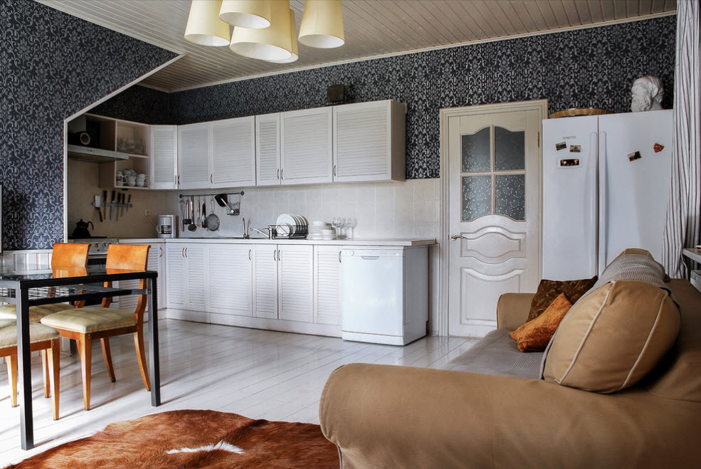 Чтобы сделать красивым и уютным такой интерьер – используйте разную отделку для потолка, стен и полов. Поделите помещение на зоны: для кухни – яркие фасады, многоступенчатый потолок, для прихожей – практичные напольные покрытия или решетки.
