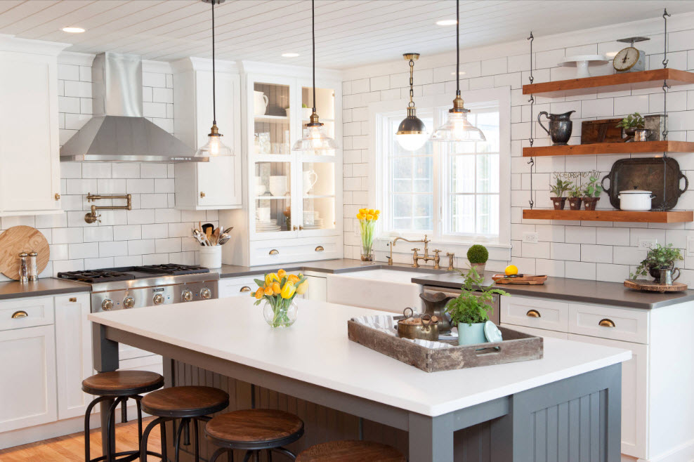 Кухня в доме может быть такой же современной, как и в городской квартире. Комфортная белая мебель, рабочая зона из плитки, вытяжка поверх печки – все это прекрасно комплектуется на кухне в частном доме.
