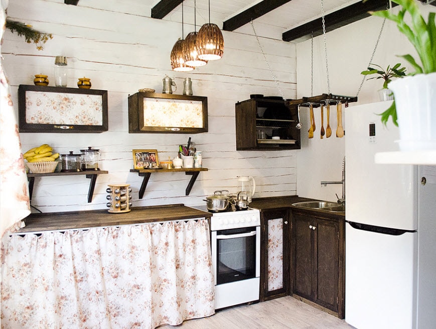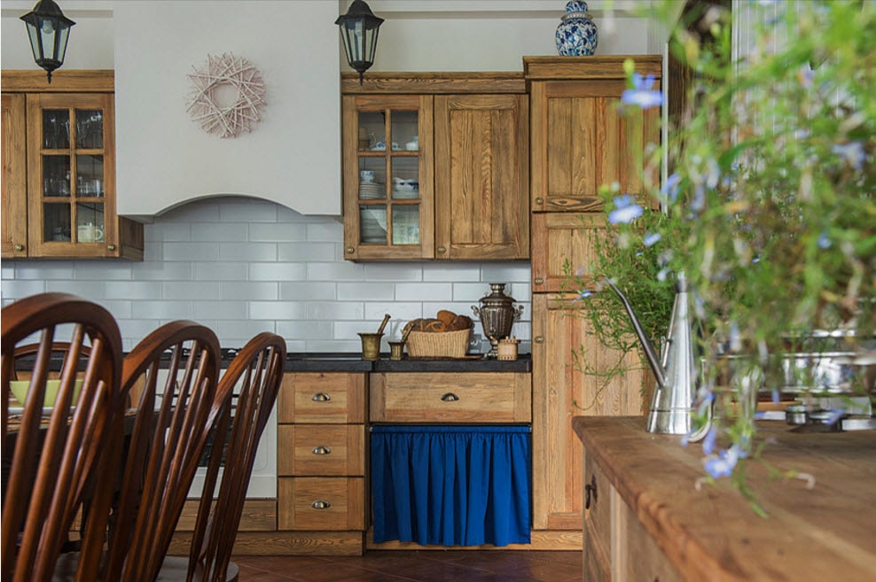 - Прованс и кантри. Одно из лучших решений для оформления кухни в загородном доме. Светлые оттенки, мебель из дерева, украшенный вышивкой текстиль, декор из фарфора ассоциируются с домом в деревне, наполненным теплотой и уютом. Цветы могут быть везде – в вазе на столе, в горшках на окнах, в качестве рисунка на шторах или узора на столовой посуде. Такой интерьер перекликается с атмосферой сельской местности и подчеркивает близость к природе.