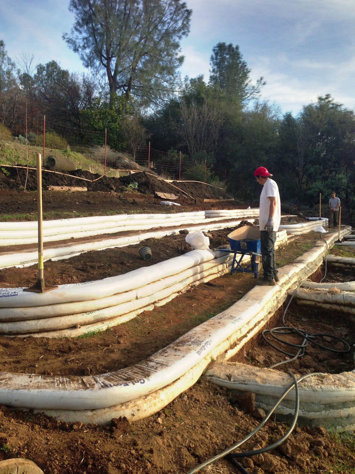 Определив высоту подпирающих стен, можно рассчитать объемы почвы, которая будет переноситься. Если количество засыпаемой и снятой земли одинаково, то можно не довозить дополнительный грунт. По линиям размещения террас ставятся колышки. С площадок убирается верхний грунт. Для землевладения небольших размеров все делается лопатами. Уступы без поверхностного слоя необходимо укрепить опорными конструкциями, удерживающими давление почвы, не дающими ей осыпаться.