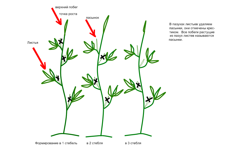 Формирование индетерминантных томатов в 1, 2, 3 стебля, схема.