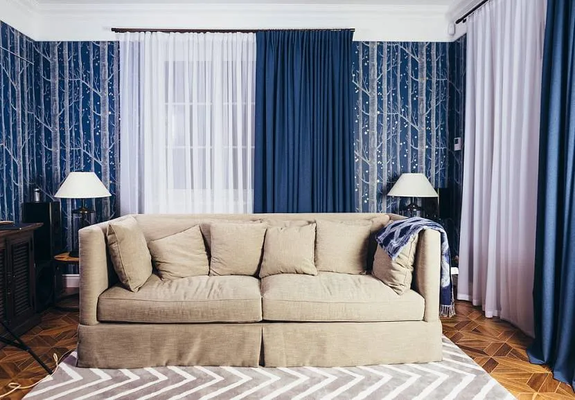 Синяя цветовая гамма может быть использована в разных интерьерах, от классики до хай-тека. Но их объединяет то, что такие оттенки делают комнату холодной. Поэтому и шторы лучше подбирать в холодных тонах, чтобы не нарушать гармонии. С этими оттенками сочетается белый, бежевый и серый.