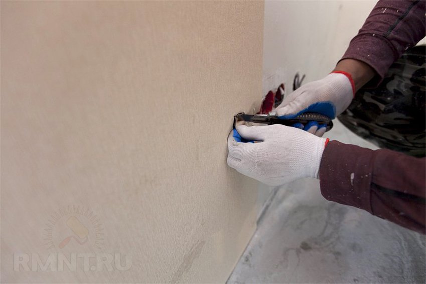 Отрезать нужно очень острым ножом. Если используется тупой нож, то качественно разрезать размокшее покрытие невозможно. Поэтому лучше всего использовать канцелярский нож и перед отрезанием отламывать затупленное лезвие. Нижний рез не столь важен, так как там обычно перекрывается плинтусом.