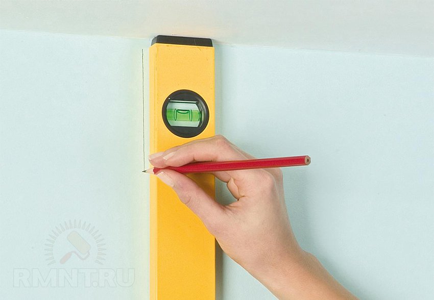 Второй этап – это разметка. Без нее нельзя обойтись, особенно она важна в том случае, если на обоях имеются горизонтальные или вертикальные рисунки и узоры. Если лист был наклеен неправильно, то уклон будет очень заметен в местах стыков или около проемов в стене (окна или двери). Итак, при помощи горизонтально отвеса проводится вертикальная линия, по которой следует клеить первый лист обоев.