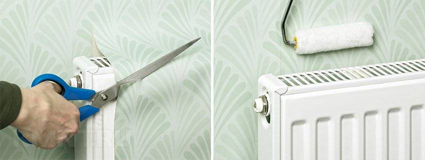Многие оставляют место за батареями не оклеенным и просто закрашивают его краской, подходящей под цвет обоев. Но если все же было принято решение оклеить стену и сзади радиатора, то нужно разрезать рулон на куски по 10 см и клеить их при помощи валика на длинной ручке.