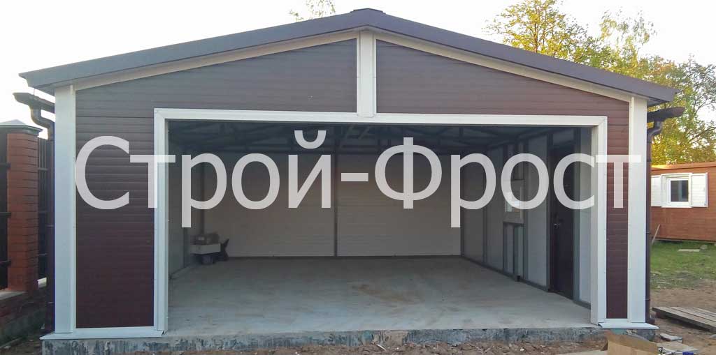 Каркасный гараж на 2 машины, фундамент – плитный, ворота – секционные