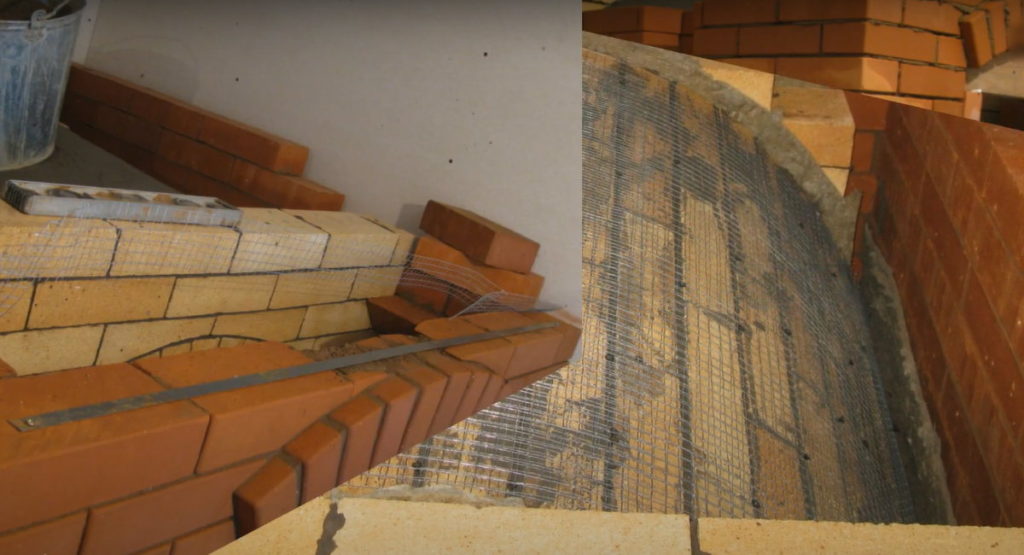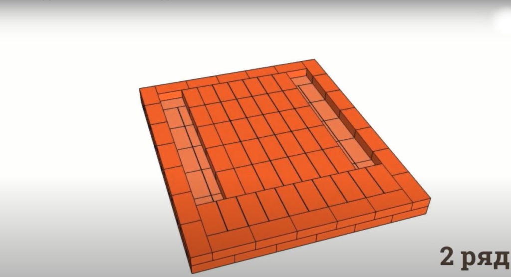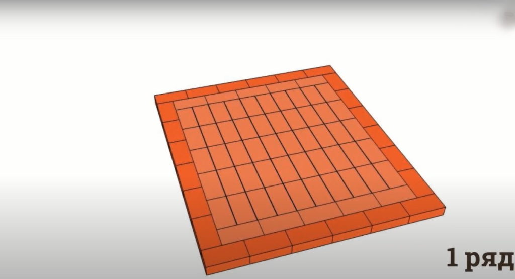 Если первый ряд формируют с выступом из кирпичей с закругленными краями, то второй ряд – это контур вертикали стенок