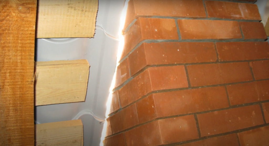 Когда русская печь устанавливается в проеме, прорезанном в деревянной стене, необходимо соединение концов нижнего венца. Для этого необходимы стальные полоски 60х6 мм в сечении. Их накладывают на бревна с обеих сторон стены и стягивают болтами. Для красоты проем обрамляется стояками из дерева. Зазор между деревянными деталями и печью должен быть не меньше 50 мм. Этот зазор называется «разделка». В фундаменте под стеной также должен быть промежуток, в который фундамент печи должен входить с отступкой 5 см.