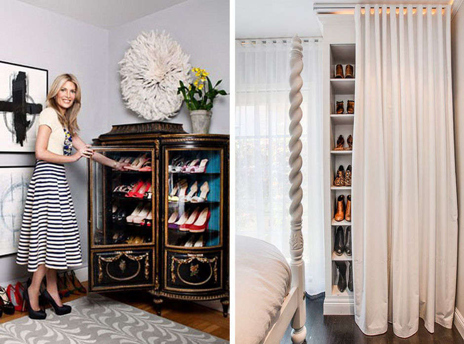 Если гардеробной нет, а хранить обувь, как на выставке, хочется, то можно установить в спальне сервант или стеллаж (может быть, даже книжный подойдет), который при случае можно прикрыть шторой.