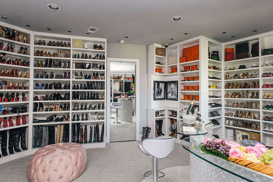 Гардеробная комната — наиболее удачное место для размещения всей имеющейся обуви — от сапог до домашних тапочек. Для неё должны быть предусмотрены специальные, отдельные конструкции. Очень удобно расположить различные типы обуви по секциям под соответствующей одеждой, кроссовки под спортивным костюмом, а туфли под платьями. Женские сапоги с высоким голенищем лучше подвешивать на специальные вешалки с зажимами, тогда вы избежите полос и следов сгиба. Невысокие ботинки, кроссовки и туфли можно хранить на выдвигающихся полках, чтобы было удобно выбрать нужную пару.