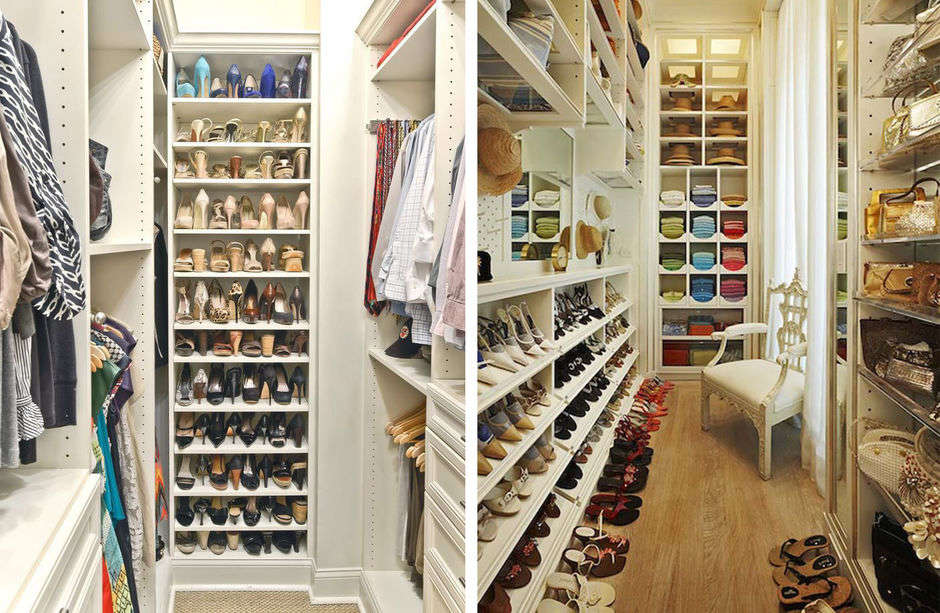 Если нет проблем с площадью, можно оборудовать гардеробную. Для этого надо купить некоторые комплектующие элементы. Это могут быть обычные рейки, позволяющие закрепить обувь за каблуки, и ее будет видно.