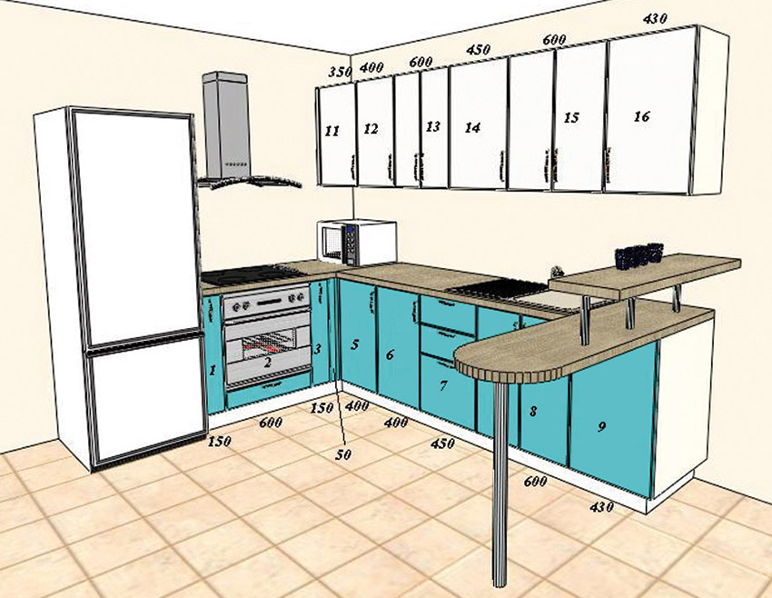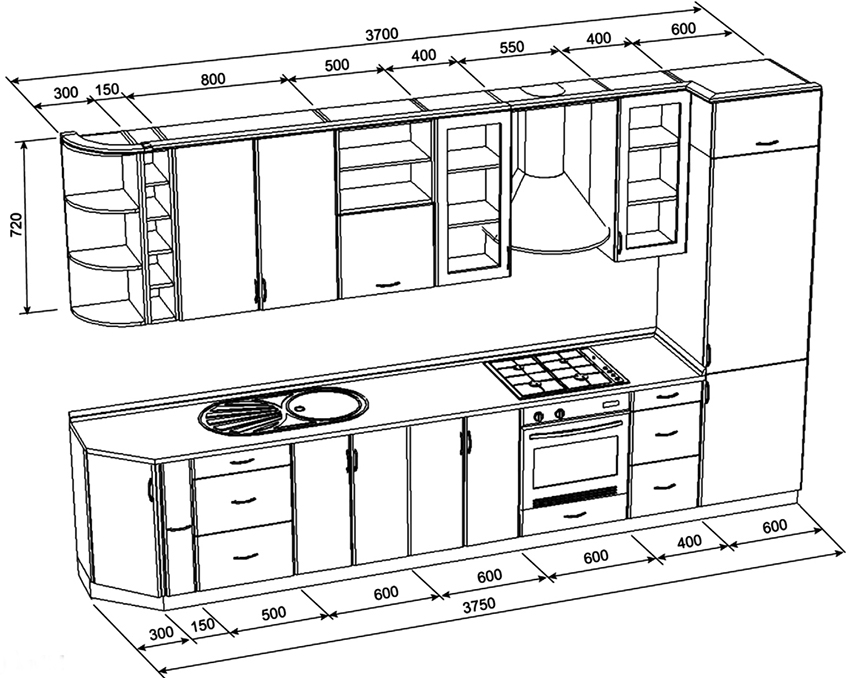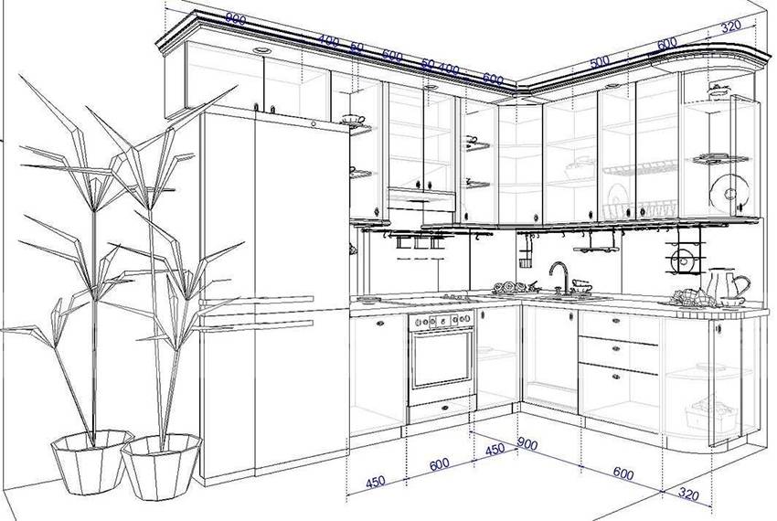 Основу будущего проекта кухни составляют имеющиеся коммуникации. Предварительно следует удостовериться, существует ли возможность перенести их при необходимости в более удобное место, или это запрещено. Затем нужно замерить параметры помещения в ширину и в длину, используя рулетку. Полученные результаты необходимо перенести на план. Последний вариант предпочтительнее, поскольку предоставляет возможность создания трехмерного изображения будущей кухни.