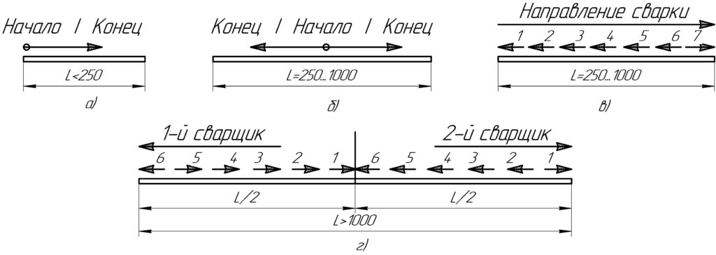 Последовательность наложения сварных швов разной протяженностиНаправление сварки указана стрелками.1-5 – последовательность сварки в каждом слое. а) на проход; б) от середины к концам; в) обратно ступенчатым методом; г) от середины к концам обратно ступенчатым способом, двумя сварщиками