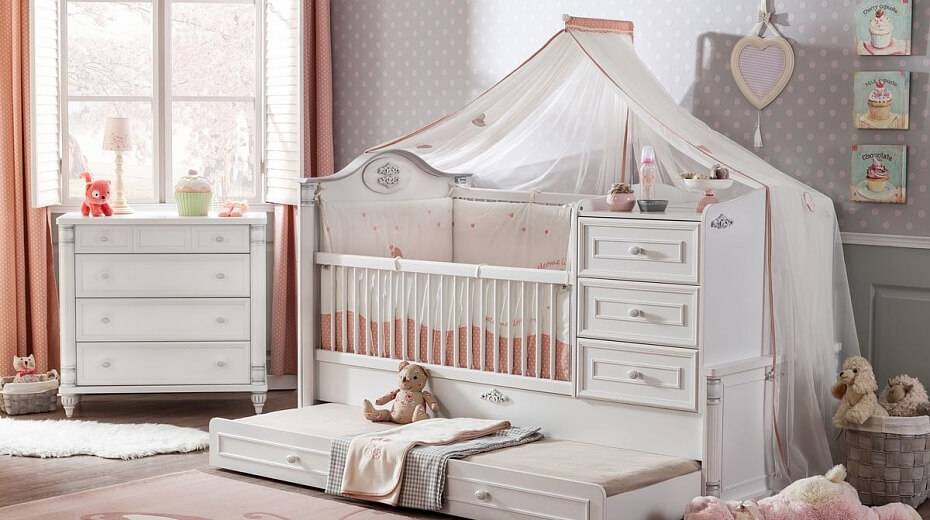 Лишние предметы лучше убрать – они собирают пыль и затрудняют уборку. Также не стоит покупать мебель «на вырост», но если вы хотите, чтобы уже в возрасте 1,5-2 года малыш постепенно привыкал спать «как взрослый», можно приобрести кровать-трансформер. Некоторые модели, к тому же, имеют полочки и столики, поэтому будут удобны не только детям, но и родителям. А от случайных падений во сне помогут бортики безопасности или кроватки с уже встроенными бортиками.
