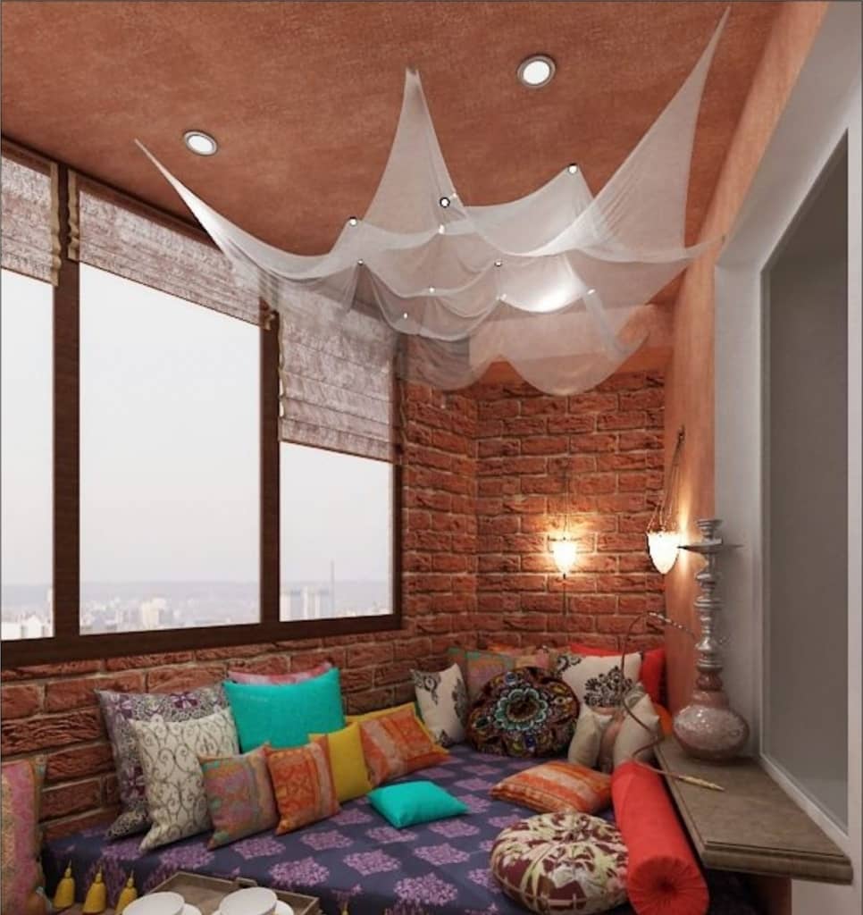 Сделать из балкона уголок для отдыха тоже не сложно. Причем создать интерьер можно в стиле минимализм. Достаточно ковра на полу и 5-8 небольших подушек. Получится отличное пространство, где можно чаевничать с друзьями. Изысканность интерьеру придаст кальян.