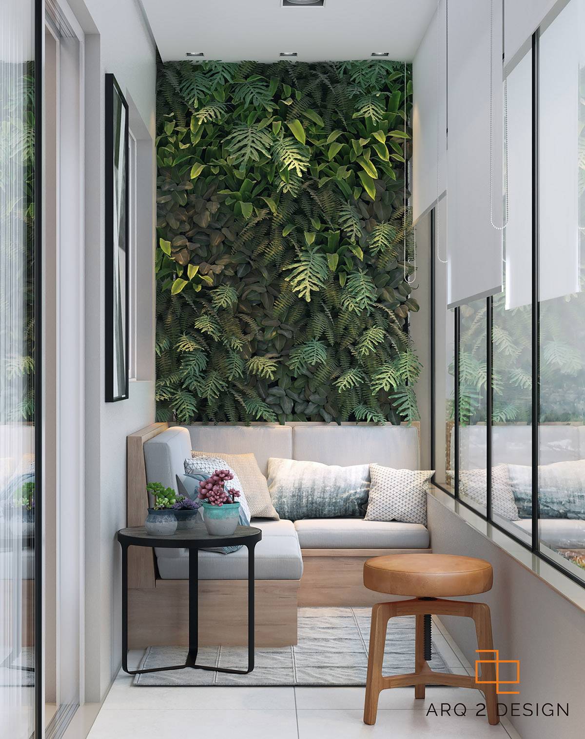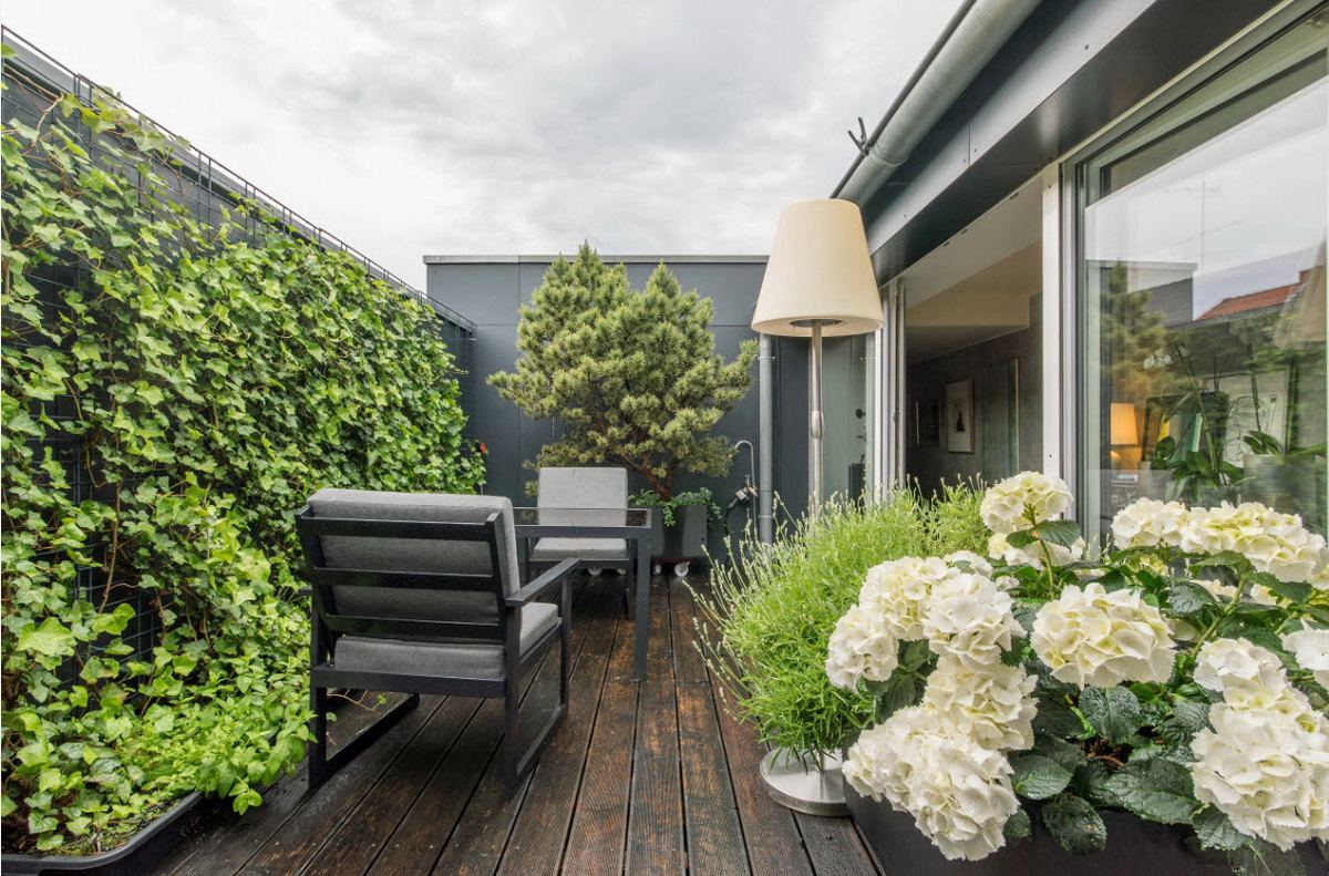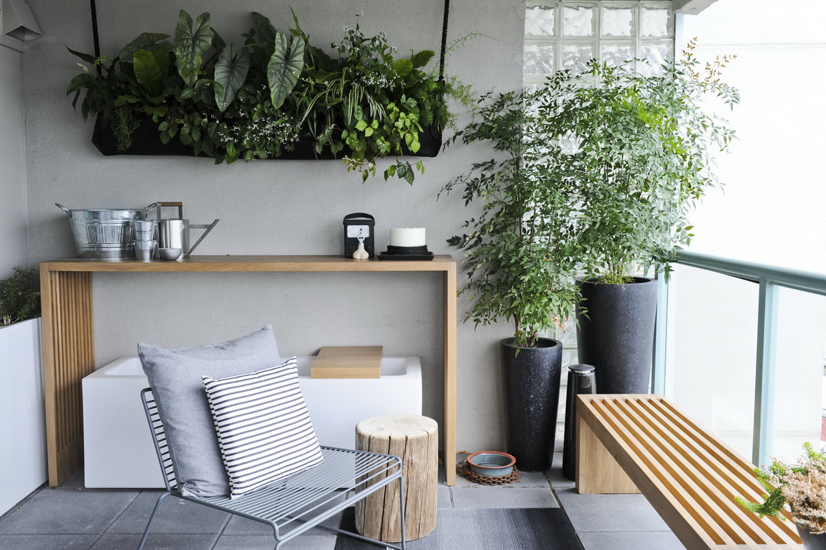 Еще одна современная идея для интерьера балкона — вертикальное озеленение. Можно установить на стене специальную решетку или лестницу, по которым и будут карабкаться стебли вьющихся растений. Либо просто повесить горшки с цветами на стену на разных уровнях, так, чтобы их стебли свободно спадали вниз. Такая зеленая стена придаст любому балкону неповторимый природный уют. Еще один плюс — такое оригинальное решение подойдет для помещений абсолютно любой площади.