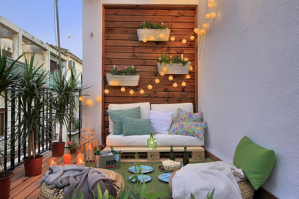 Фонарики и гирланды на балконе помогут создать романтическую и уютную втмосферу.