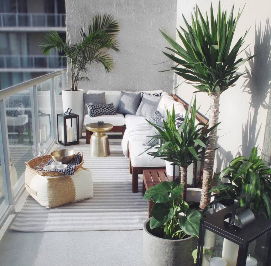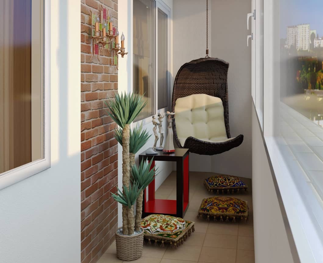 В балконе можно поставить всего два плетеных кресла и небольшую пальму. Уют и комфорт в такой обстановке – обеспечен. Маленькие по площади балконы не нужно заставлять мебелью.