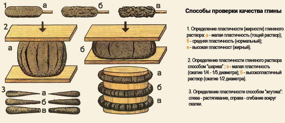 Первое, что необходимо установить – жирность материала. Различают тощую, нормальную и жирную глину. Первая непластична и при высыхании раскрашивается, вторая дает небольшую усадку и не растрескивается. Высушенные пластинки из жирной глины эластичны, но при сушке сильно растрескиваются, хотя и сохраняют прочность.