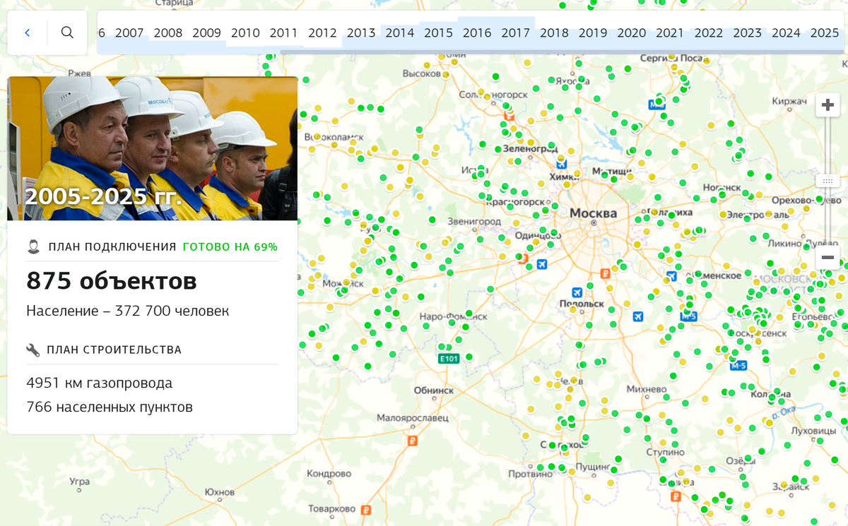 На карте зеленым указаны газифицированные населенные пункты, входящие в программу, а желтым — планируемые. Если у вас дом в Москве или МО, вы можете найти на карте свой и посмотреть, планируется ли подводить туда газ