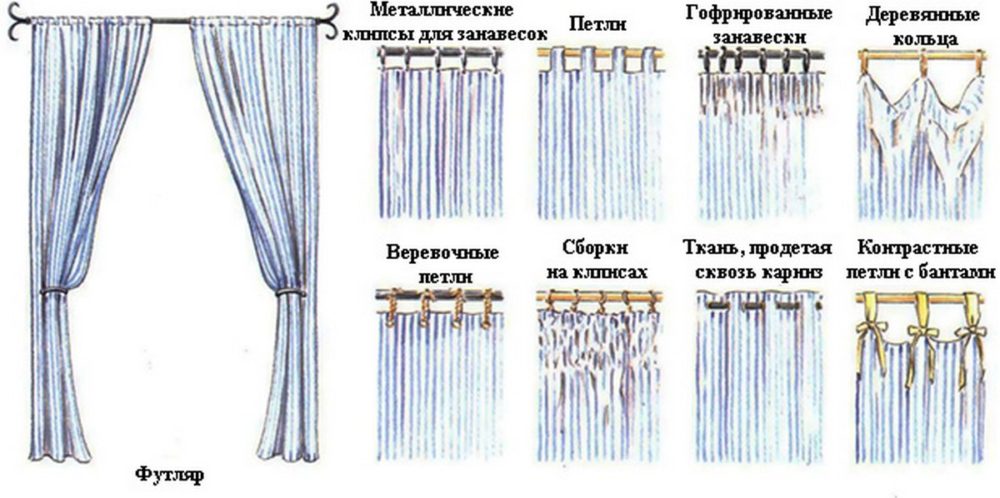 Что касается самих вариантов крепления занавесок, они могут быть следующими: