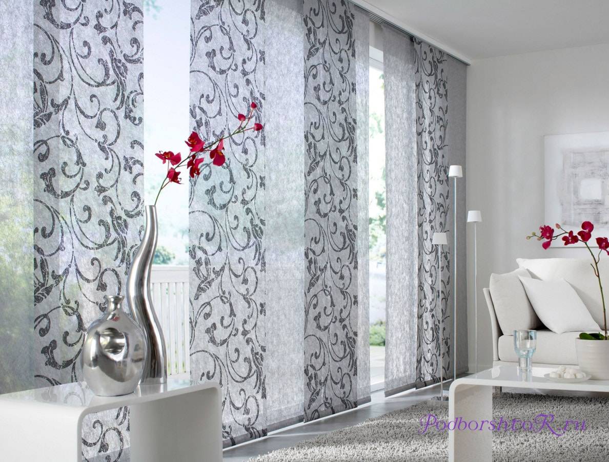 Японские занавесы крепятся на специальные потолочные карнизы. Рассчитать длину шторы в данном случае очень просто. Она равна высоте стены. Ширина створки, как правило, равна 60 см, однако можно заказать и большего размера.