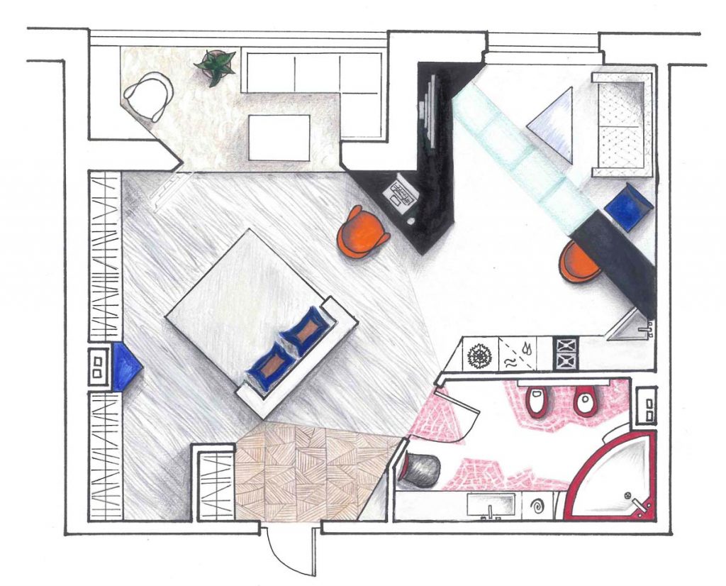 4. Для двухкомнатных квартир и других небольших жилищ идеальным вариантом может стать разделение гостиной на отдельные участки, например на зону развлечений и домашний офис, как на следующей схеме.
