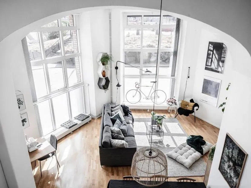 Здесь можно сочетать мебель разных цветов и стилей. Массивную мебель и технику обычно ставят у стены, а маленькую – ближе к центру. Таким образом, они уравниваются в размере: большой предмет стоит дальше, в то время, как маленький – ближе. Один из самых сложных вопросов в данном случае – правильно выбрать точку обзора. Обычно выбирают места отдыха (мягкая зона гостиной, кровать в спальне, обеденный стол на кухне), где люди часто проводят время.