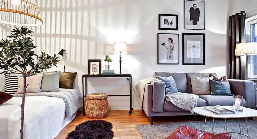 Спальня-гостиная в скандинавском стиле – воплощение чистоты, легкости и домашнего уюта. Стилистическое направление идеально подходит оформления комбинированных помещений. Преимущественно белый интерьер хорошо сочетается с деревянными деталями и яркими элементами декора.