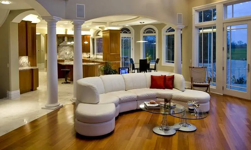Кроме того, в роли перегородок могут выступать арки, колонны, проёмы. Если комната большая, отделить зоны друг от друга некоторые дизайнеры предлагают вертикальными столбами, расположенными друг от друга на одинаковом расстоянии. При этом очень хорошо будут смотреться между ними деревянные арки или же сделанные из гипсокартона. При этом надо учитывать, что лёгкость и элегантность придадут комнате изделия с решётчатыми элементами.