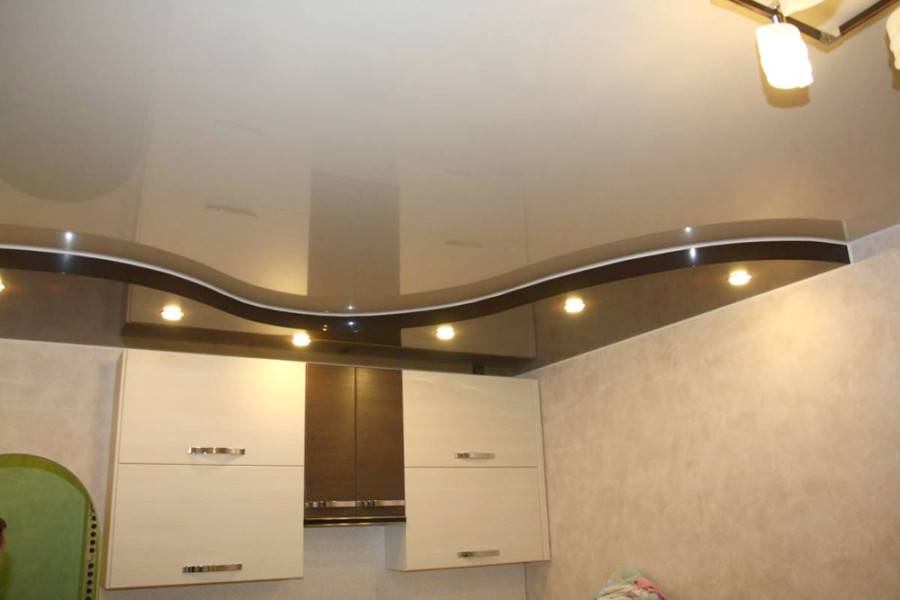 - Точечный свет. Привычная нам люстра, свисающая с середины потолка, или потолочная «таблетка»-светильник лишь усилят ощущение низкой кухни. Чтобы добиться противоположного эффекта – визуально приподнять потолок – лучше использовать встроенные точечные светильники, встроенные в потолок или мебель, а также настенные направляемые светильники и диодную подсветку. Света они дадут много, а пространство не «украдут» совсем. Если уж без люстры никак, то выберите ту, плафоны которой направлены в потолок, а не вниз, и которая максимально прилегает к поверхности потолка.