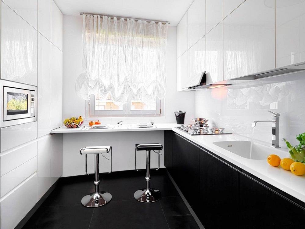 Здесь стоит сделать акцент на занавесках, шторах. Это один из главных элементов интерьера, а в комнате для приготовления пищи небольшого размера может выглядеть особенно выигрышно. Для маленьких кухонь подойдут легкие полупрозрачные шторы. Текстиль должен быть почти невесомым, хорошо пропускать свет. Солнечные лучи особенно украшают маленькие кухни. Длина гардин должна быть до подоконника. Необязательно выбирать классический вариант с двумя шторами. Вполне подойдет и одна занавеска. Ее можно обыграть красивым элементом, например, брошью.
