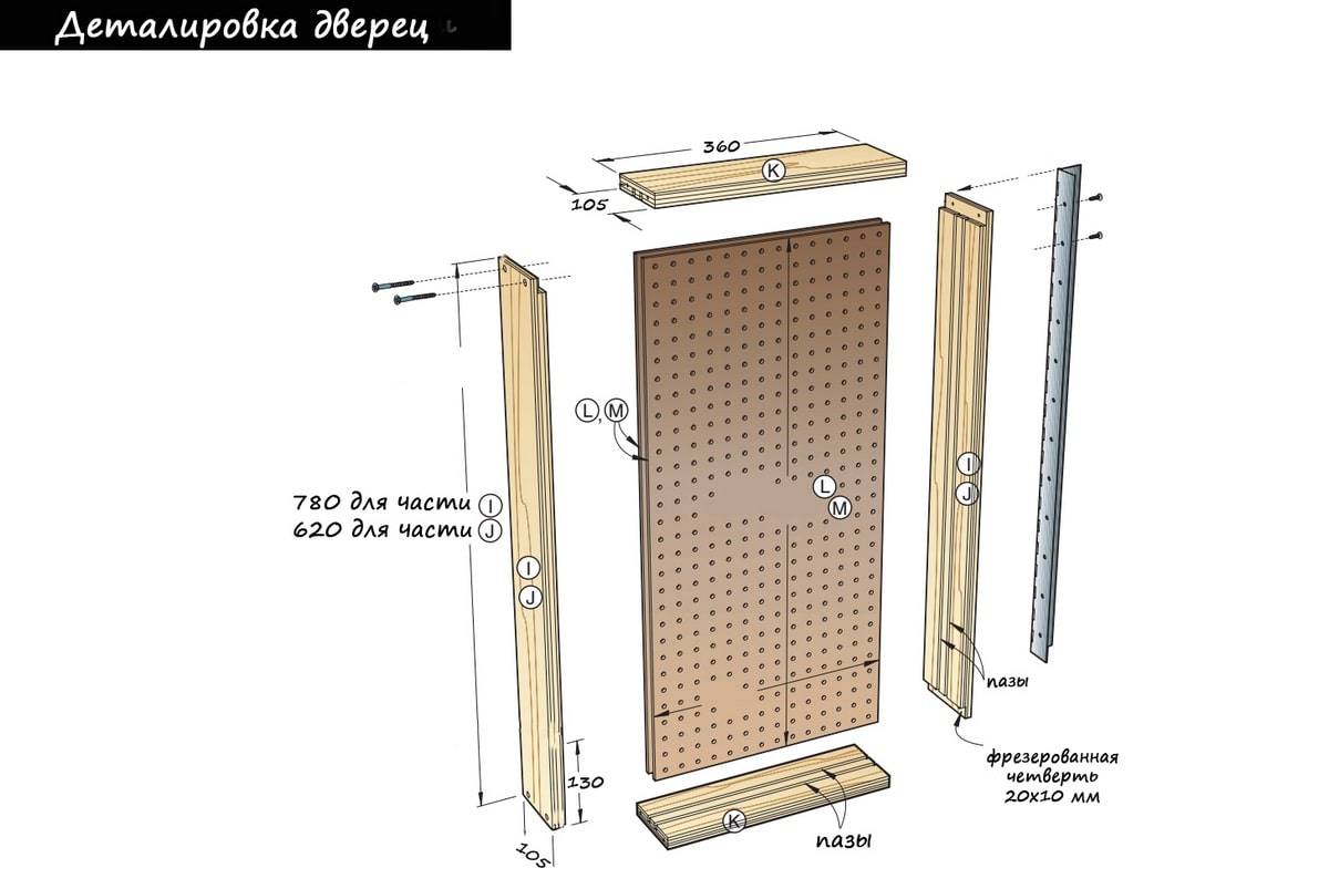 - По указанным размерам вырезают крышки и днища дверец (К) в количестве 8 шт.