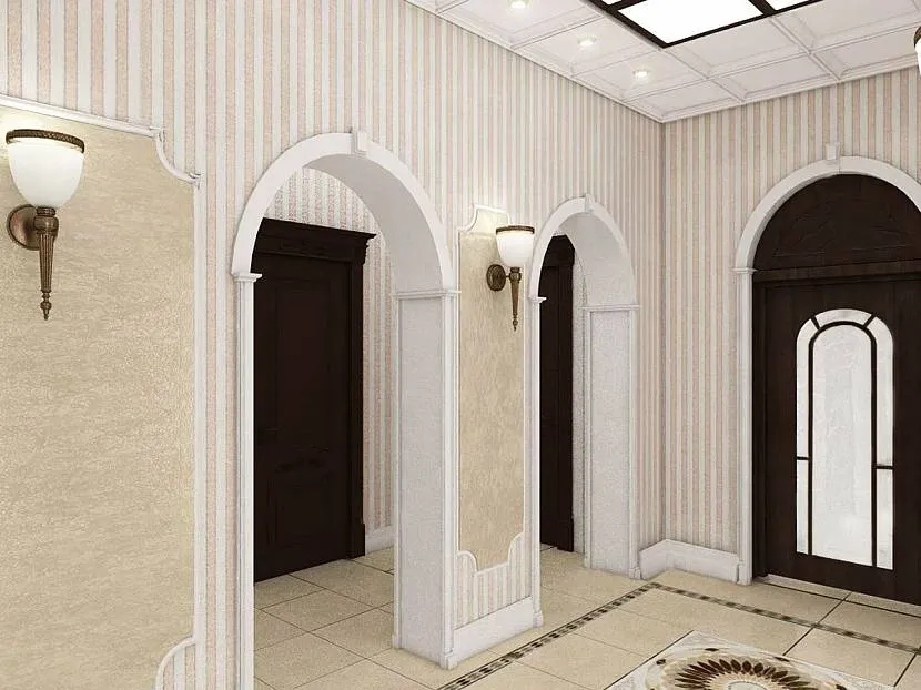 Арку можно обклеить яркими контрастными обоями, тем самым выделив её в интерьере. Также можно использовать для отделки обои с рисунком, цвет которых будет повторять цвет настенных покрытий соседних помещений. Для прихожей можно использовать облицовку мозаикой или зеркалами