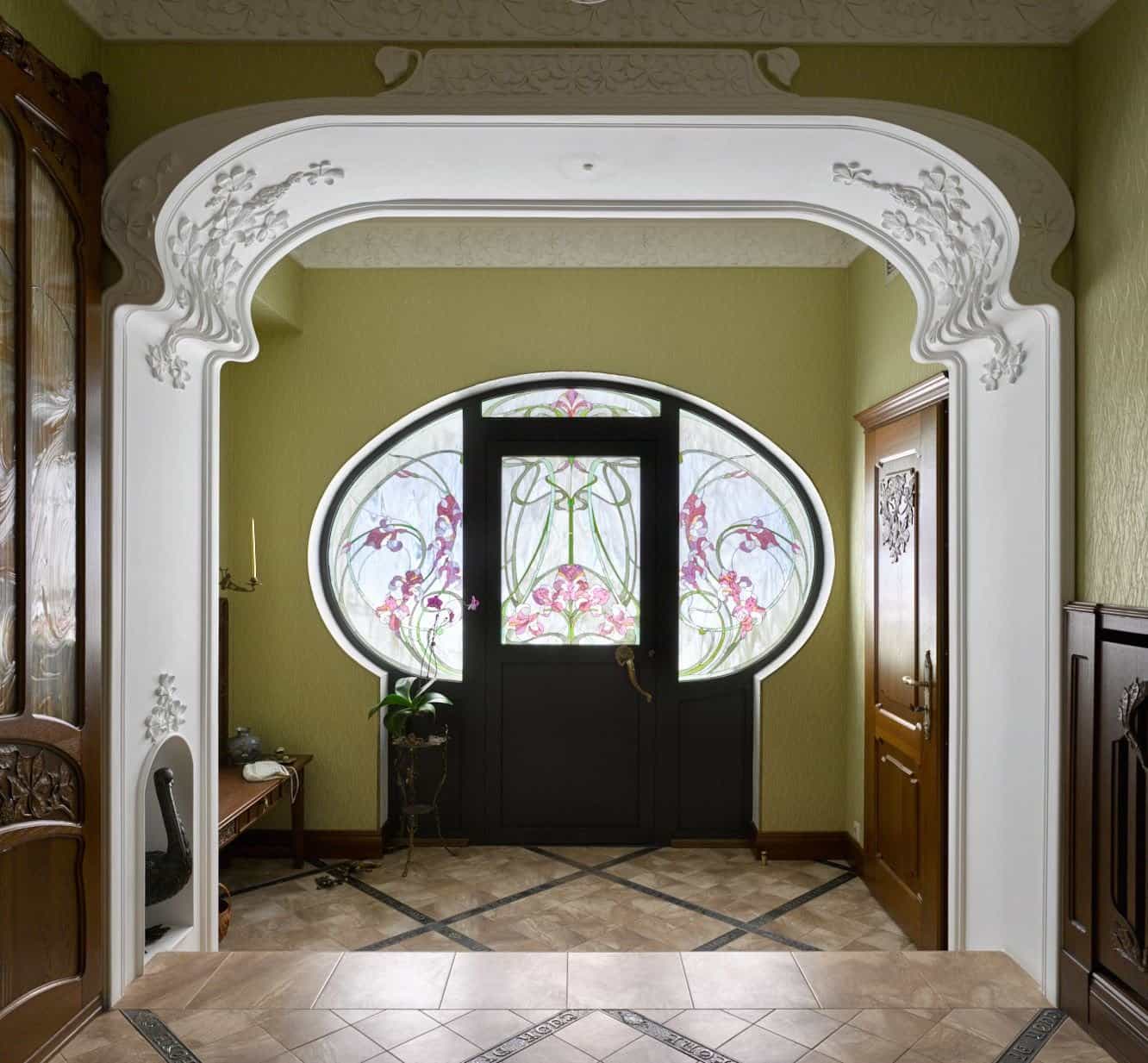 Арочные конструкции часто украшают цветным стеклом или мозаикой. Их принято оформлять и с помощью витража. Эта конструкция будет смотреться очень ярко и эстетично. Причём мозаика или витраж могут украшать как всю арку, так и её отдельные элементы.