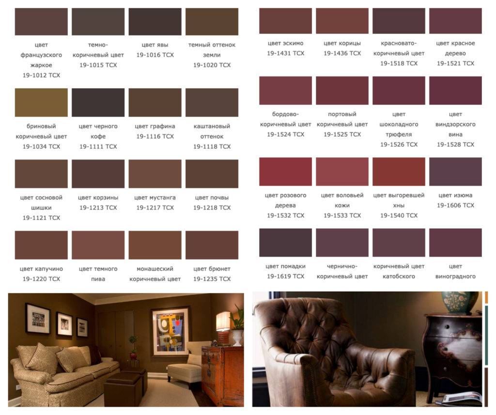 Палитра Panton (стандартизированная система подбора цветов) содержит 195 оттенков коричневого: средний и темный, яркий и матовый, с разнообразными оттенками от оранжевого до фиолетового. И, конечно же, все они также состоят из 3 основных цветов или одного основного и одного дополнительного в разном процентном соотношении. Кроме того, многие из них имеют белый или черный цвет.