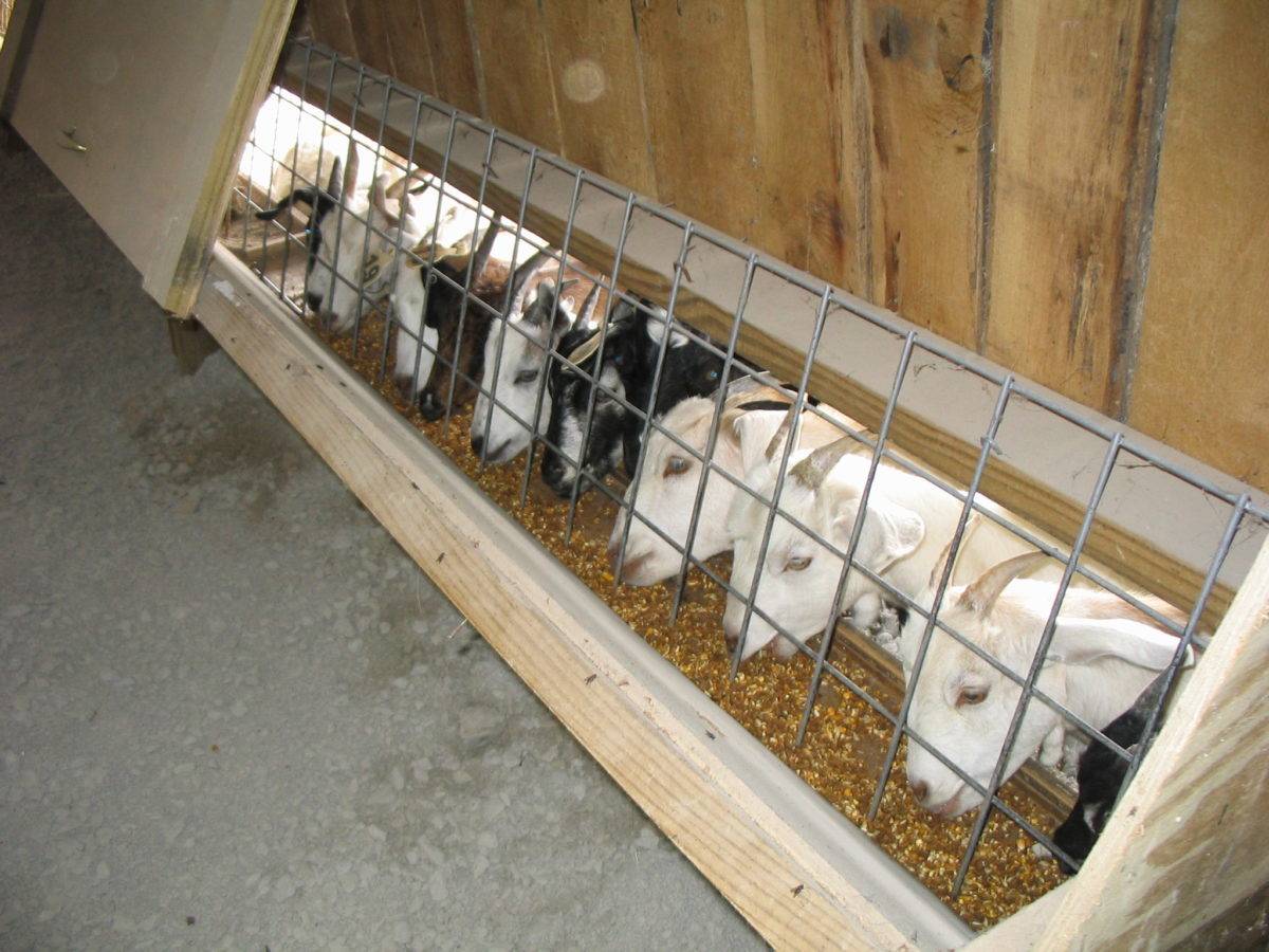 Любой тип кормушек должен иметь оградку из жердей. Промежуток между ними позволяет просунуть голову козе, чтобы взять корм, но предупреждает проникновение самого животного. Если вместе с дойными животными содержатся козлята, то щели должны быть различной ширины – делаются окошки с промежутком в 20 см на высоте 60 см от пола, а ниже опускается прорезь в 10 см. Молодняк может просунуть голову в маленькую прорезь, а взрослая коза сначала сует голову в окошко, а затем опускает ее ниже.