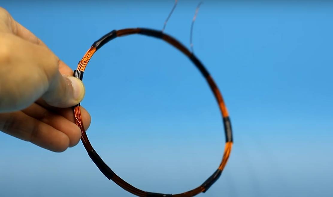 Первый провод (0,3 миллиметра) следует плотно обмотать 70-80 раз. Полученный моток можно снимать, при этом не забывая оставить два коротких отрезка под выход (по 4 сантиметра каждый). Далее круг обматывается изоляционной лентой (сначала короткими «штрихами», затем — полностью).