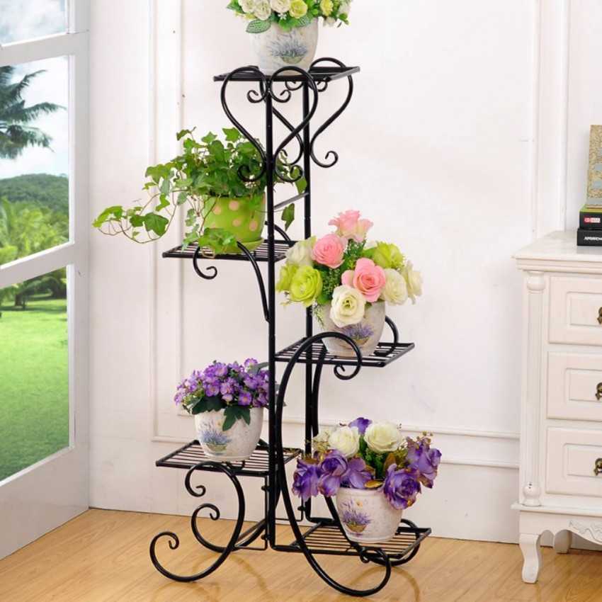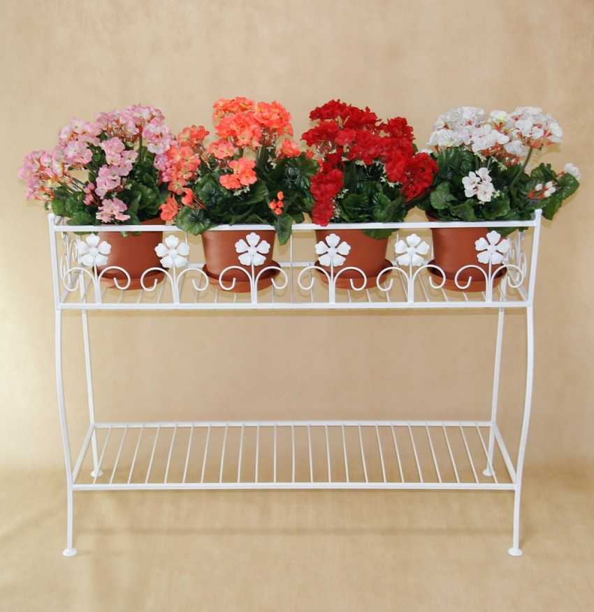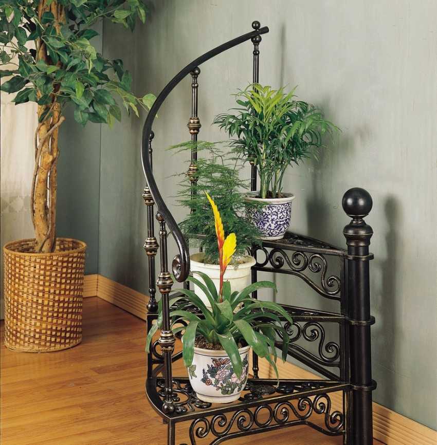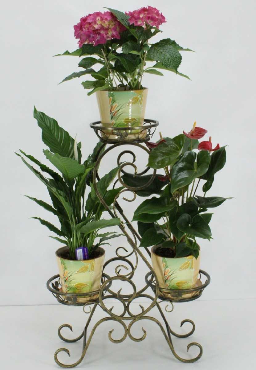 Рассматривая такое сочетание материалов в напольных вариантах цветочных стеллажей, основная работа производится по тому же плану. Предпочтение отдается вариантам в несколько ярусов, а любителям изысканности придутся по вкусу кованые цветочные подставки.