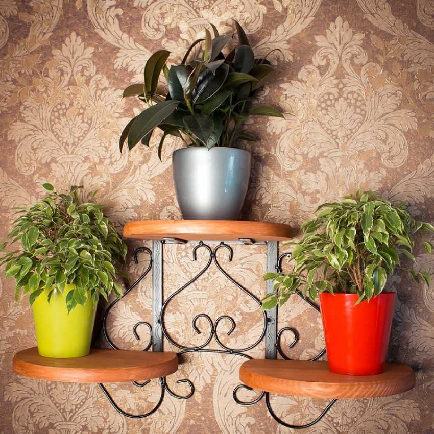 Правильно собранные и закрепленные деревянные стеллажи или полочки приспосабливаются под любое количество растений вне зависимости от размеров. В выборе настенных деревянных полочек, можно ограничится самым простым вариантом. Для этого берется необходимой длины брус, покрывается лаком или краской и крепится с помощью металлических уголков к стене.