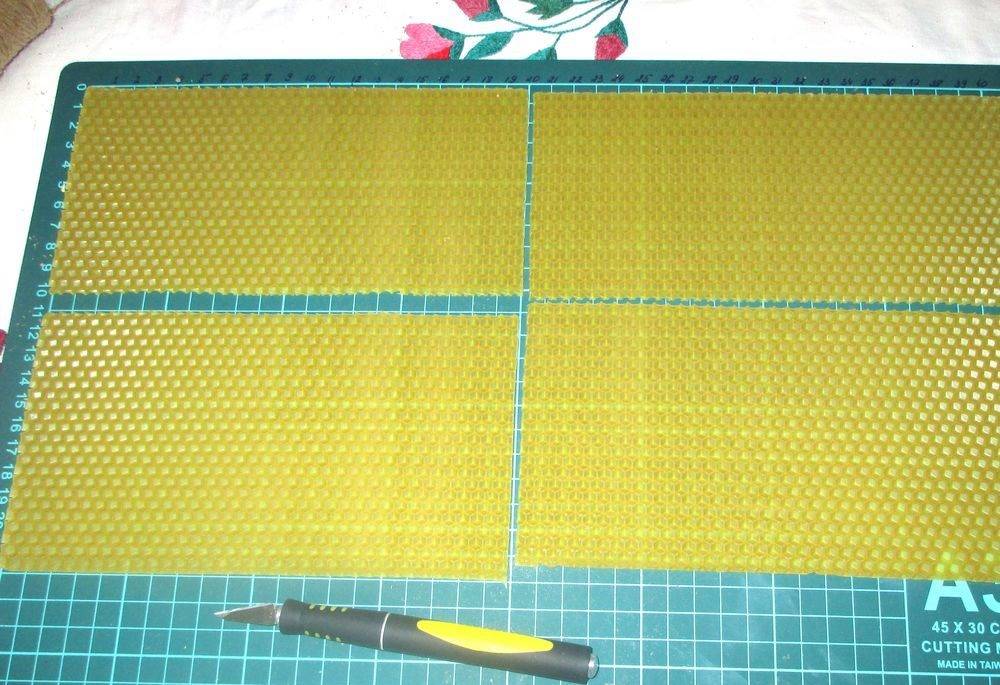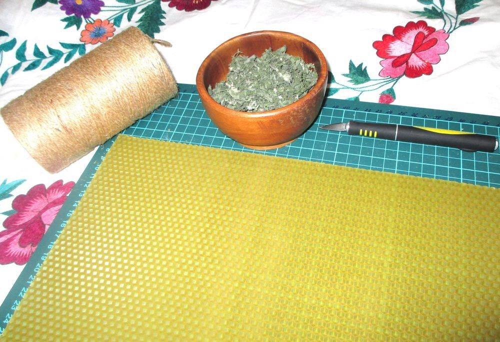 Еще одна несложная пошаговая инструкция. Помимо самой вощины (в примере используются листы 20х40 см), для работы потребуется следующее: