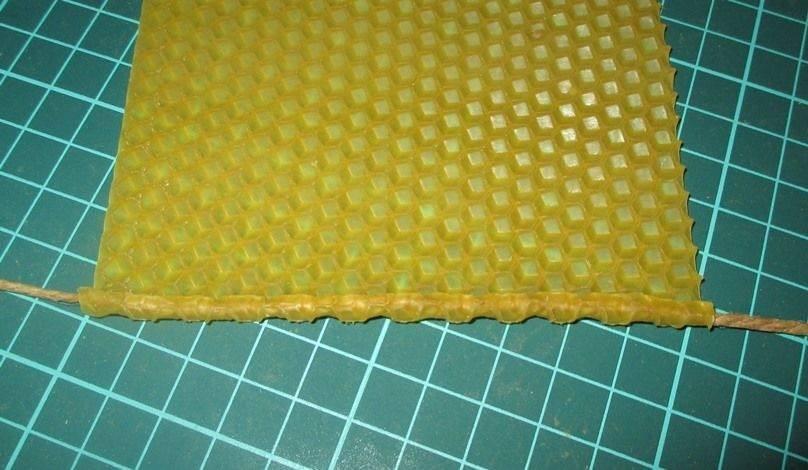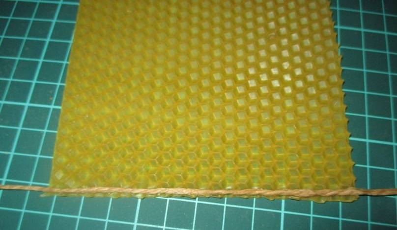 Шаг 2. Отрежьте фитиль в соответствии с размером вощины, добавив по краям по 2 см. Натрите фитиль кусочком воска (на фото вы можете увидеть пример натертой и не натертой нити).