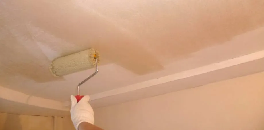 Суть метода в следующем: Малярным валиком (лучше поролоновым) вам нужно обильно намочить белёный потолок водой. Не мочите весь потолок, а делайте это участками по 1-1,5 метра.