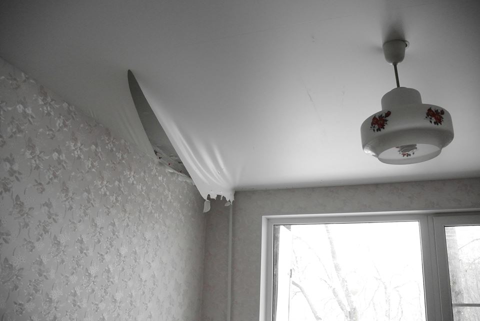 В случае потопа демонтируйте светильники и при помощи шланга слейте воду с потолка. Хорошо его просушите и верните осветительный прибор на место. Если светильников в потолке нет, то придется отсоединять край или угол материала.